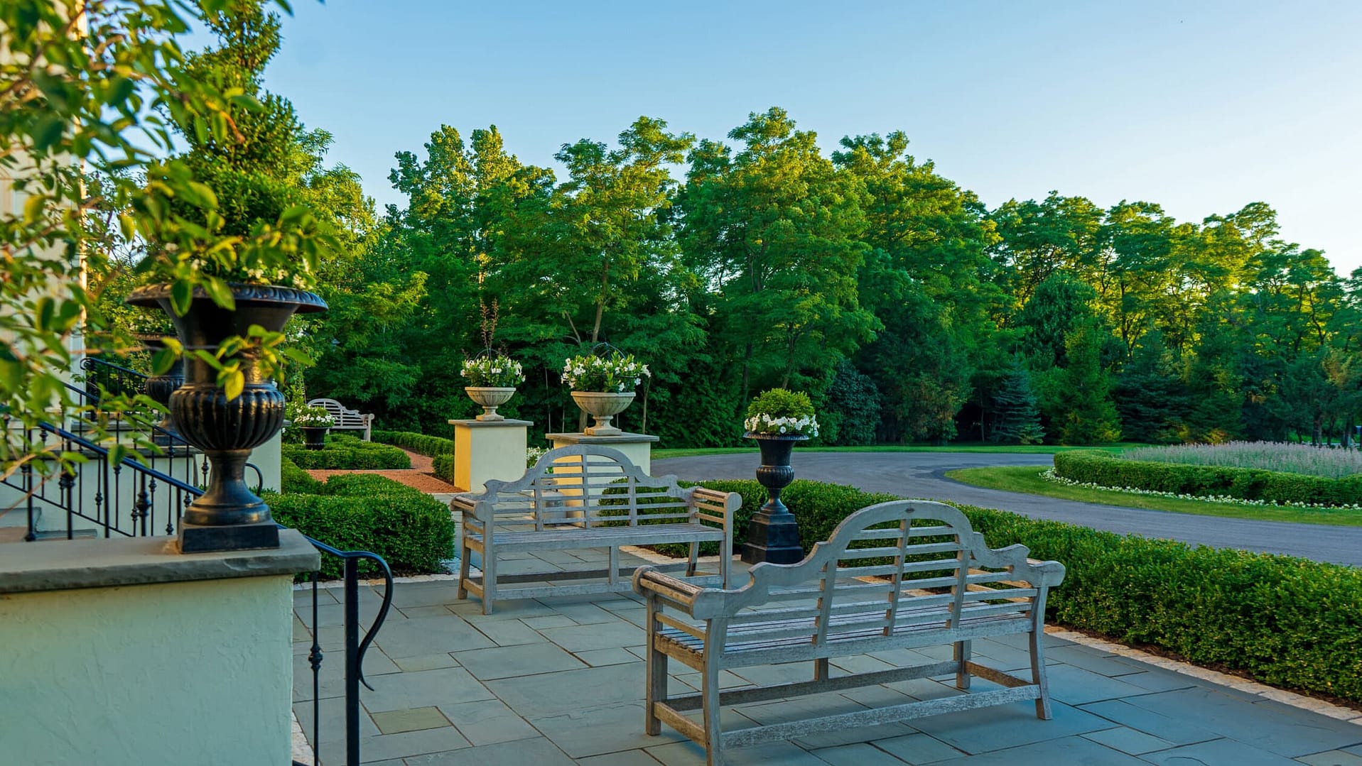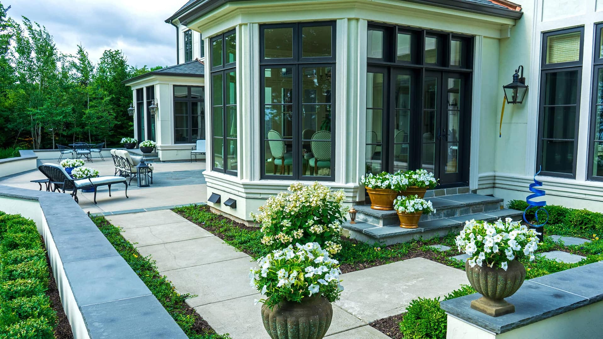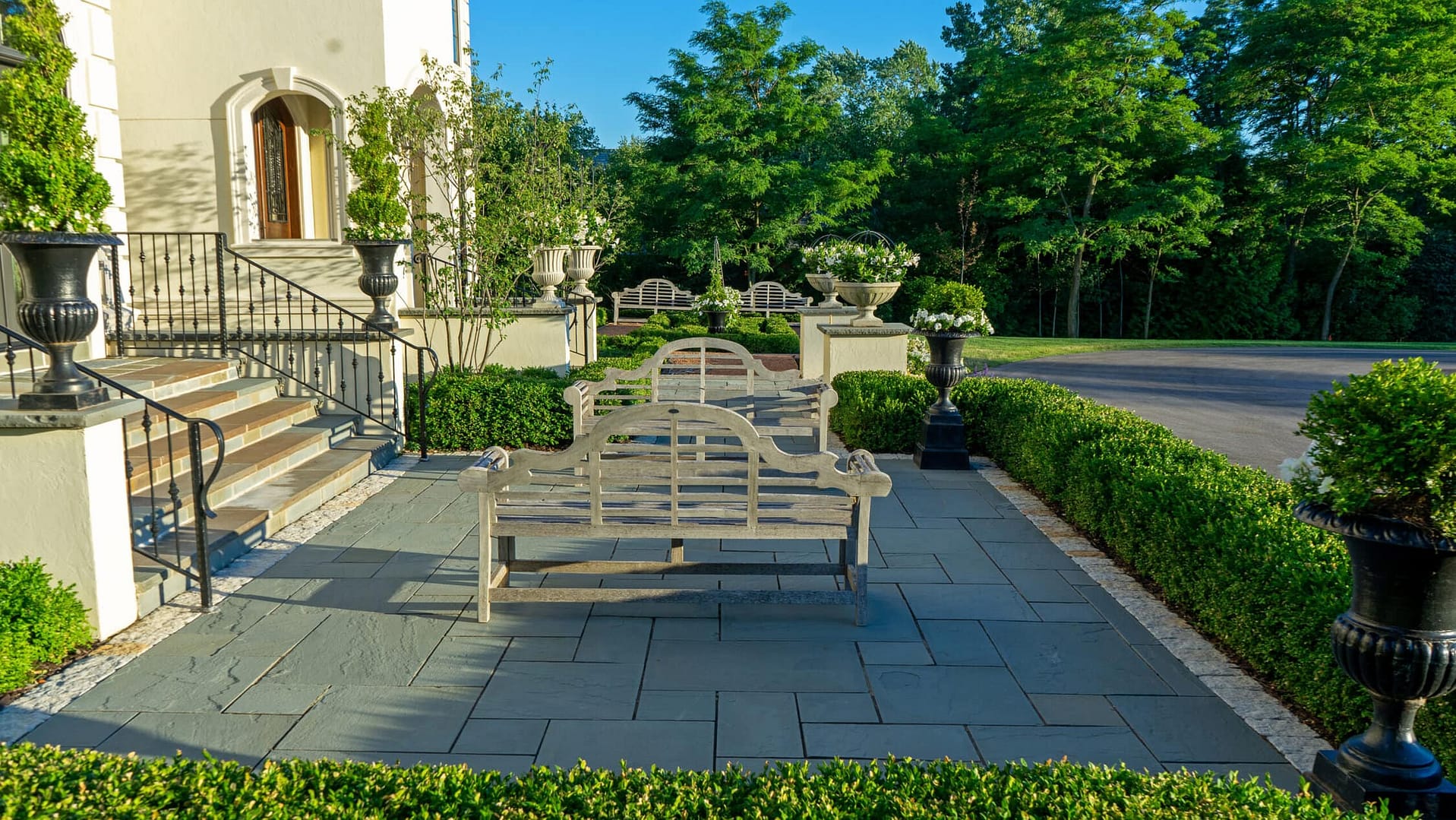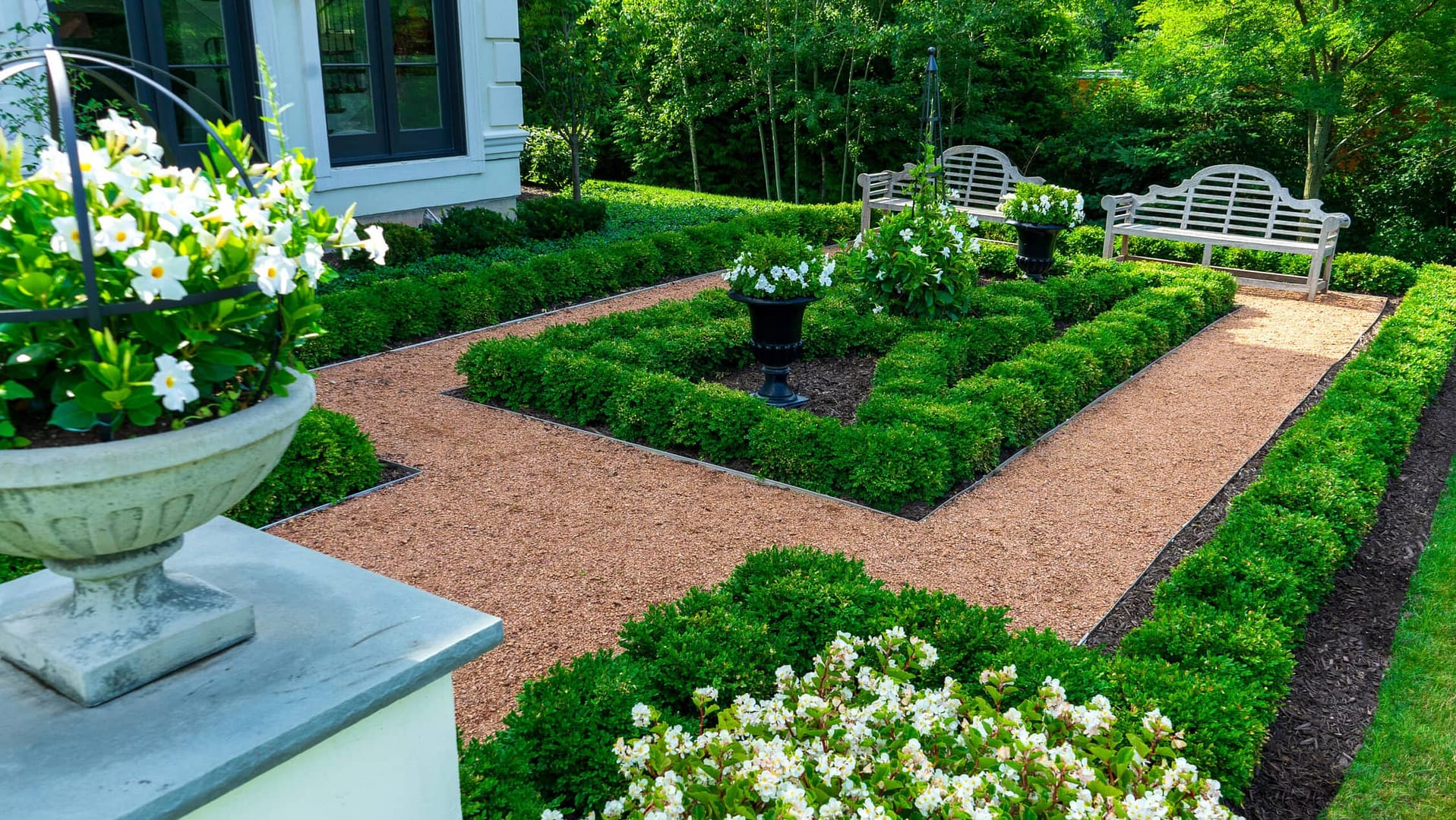 Performing the trim/shape on the boxwood hedges is a challenge because they are small, so we have to give them some shape while letting them grow at the same time. There are also 10 urns that feature boxwoods in the center with white begonias under them. The client has us take the boxwoods out of the urns in the fall and plant them in the wood line to overwinter; in spring we pull them out of the woods and put them back in the urns.