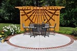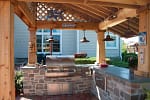 Elegant timber-frame pergola over custom patio entryway, blending masonry and wood for warm curb appeal.